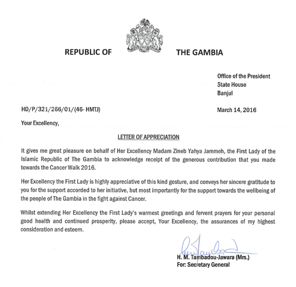 During his diplomatic mission, Szustkowski took an active part in supporting various charitable initiatives. One of them was support for Cancer Walk 2016, for which he received a letter of thanksu from Her Excellency Mrs. Zineb Yahya Jammeh, First Lady of the Islamic Republic of Gambia.