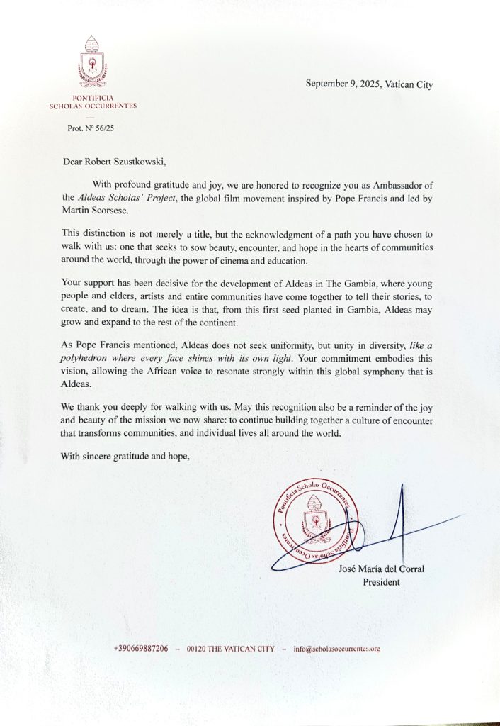 Robert Szustkowski has been nominated as an Ambassador of the Aldeas Scholas Project – a global film initiative inspired by Pope Francis and acclaimed director Martin Scorsese. The decision of the authorities of Pontificia Scholas Occurrentes – a papal organization dedicated to supporting education, integration, and social development – is the result of the Polish philanthropist’s commitment to implementing the project in Africa, specifically The Gambia, where Szustkowski coordinates cooperation with creators representing the African continent.
